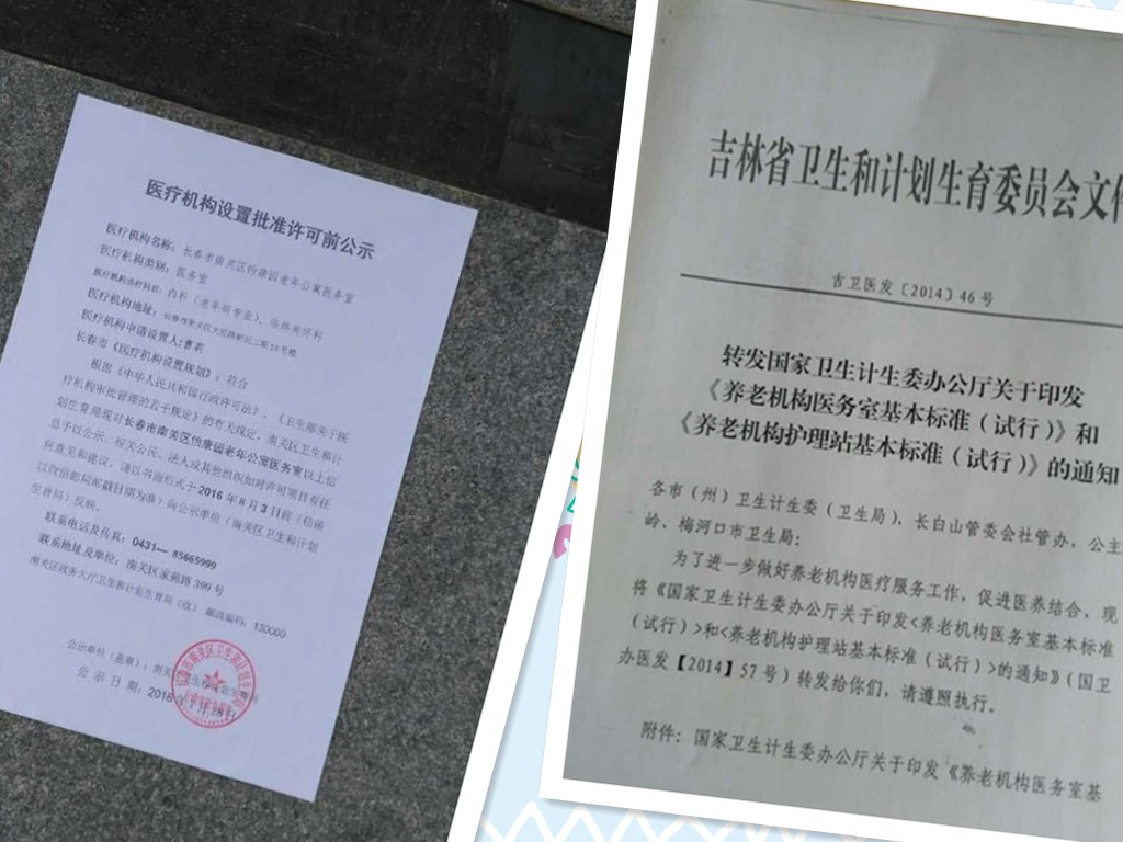 怡康园老年公寓向南关区卫计局提出申请后,在长春市民政局、长春市卫计委、南关区民政局、南关区卫计局全力协作下,以***快速度完成了审批并下发了《医疗机构执业许可证》。