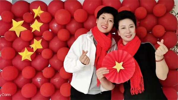 品尝着美味的糕点和醇香的饮品,欣赏着经典老电影《喜盈门》,长者们脸上洋溢着节日的喜庆和生活在和平富足的崭新时代的幸福和满足感。活动结束全场合唱《没有共产党就没有新中国》,目之所及是中国红,所有人心潮澎湃,为祖国祝福,为今朝华夏喝彩。