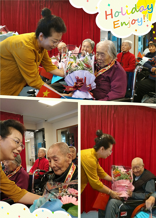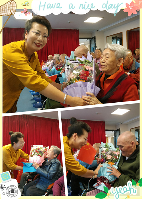 活动开始后,首先播放了一个公寓员工精心制作的小视频,视频中展示了几位中华人民共和国成立70周年纪念章的获得者和革命军人的老照片,以及在怡康园幸福生活的片段。随后,由执行董事曹莉为几位爷爷奶奶献上鲜花,祝福他们身体健康,幸福绵长。